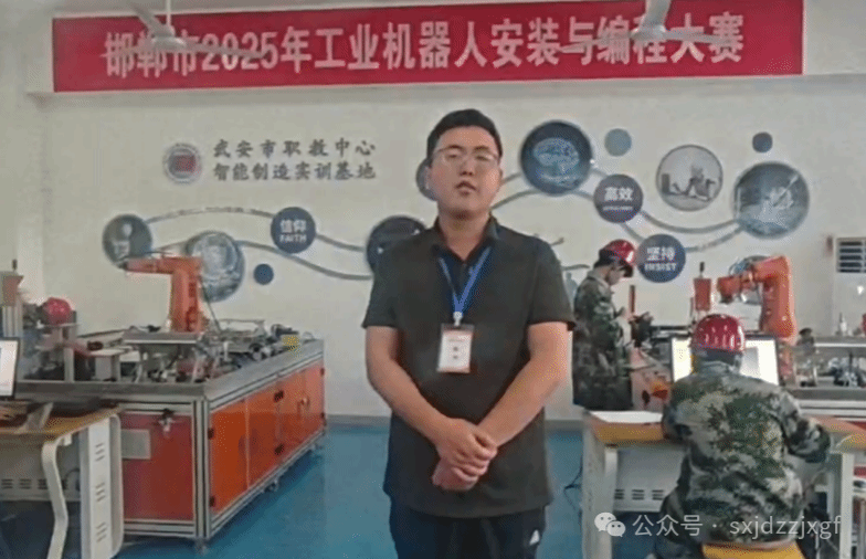 吴华健,数控设备1516班,现就职于北京华航唯实机器人科技股份有限公司机器人工程师,主要负责中、高职和职业本科各类院校机器人、物联网等实训平台的维护维修,中、高职和职业本科教师的培训工作,线上分享期间吴华健正好在邯郸市2025年工业机器人安装与编程大赛比赛现场,负责现场技术支持工作,通过视频向学弟学妹们介绍了工业机器人安装与编程大赛涉及到的相关技术和比赛内容,展示了大赛的关键技能。
